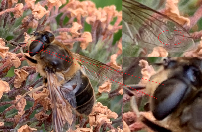 Conveniently it had one of its wings held out at a right angle, and we noticed something odd. It didn’t have what is known as the R4+5 Vein Loop, something all Eristalis species have. The trio of images below are of Eristalis tenax, otherwise known as the Drone Fly. The top right image below shows the vein loop circled in close-up.