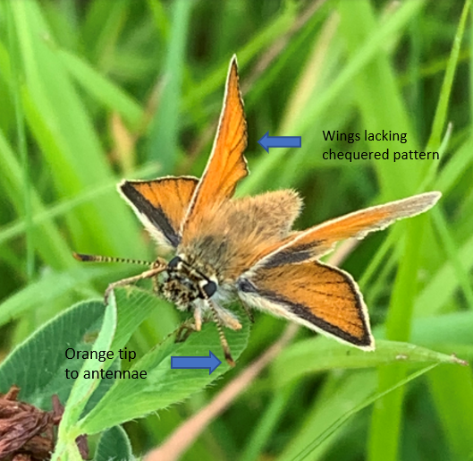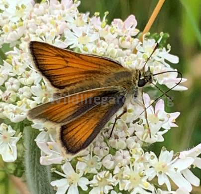 Comparing the Small Skipper above with the specimen below, we feel the image below may be of an Essex Skipper. It doesn’t appear to have the orange/brown tip to the antennae which the Small Skipper clearly has. Instead it appeared to have a very dark tip to the antennae which is a distinguishing feature of this species. It is also lacking the chequered pattern on its wings which would otherwise suggest it was a Large Skipper. These features combined suggest this could well be an Essex Skipper, which is fairly common in the South and East of the Country.