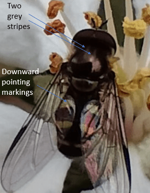 The species was determined by the distinct characteristics, albeit faint examples, of the two grey stripes across the thorax in combination with the downward-pointing markings on the abdomen (*1).
