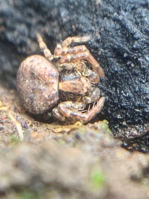 This tiny spider, belonging to a genus of crab spiders, was spotted by luck on the bark of our felled buddleia. We just happened to notice a tiny creature shuffling about and on closer inspection discovered this fantastic looking spider.
