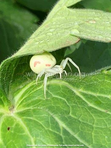 We were aware and had seen photographs online about it appearing from time to time in a yellow form, often very bright yellow and in May this year we finally witnessed this for ourselves, this time lurking menacingly in the apple tree. Apparently this species can change it’s colour within the range of the above to the below to best suite it’s surroundings. Although we were a little baffled as pale green/white would have made this little lady stand out less on the pale underside of the leaf we found her on. But maybe invertebrates view these colours differently, or perhaps she had moved up from the creeping buttercups at the base of the tree. In any case we did read that in order to turn full on yellow like this, the female (males don’t have this ability) has to accumulate a certain substance within her skin which can take up to three weeks, so it must be a gradual change.